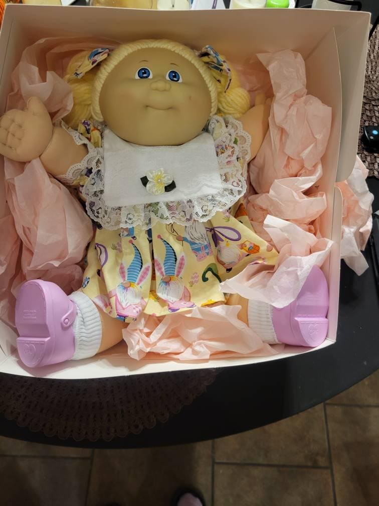 This one-of-a-kind custom 1983 vintage Cabbage Patch Kid is full of personality and charm! She has beautiful rerooted long blonde yarn hair, bright blue eyes, rosy cheeks, and a single sweet dimple that gives her a playful expression. She features the black Xavier Roberts signature from the original 1983 first edition on her bottom. Please note her original body tag has been removed. This dolls reroot was not done by me. I received her as is.